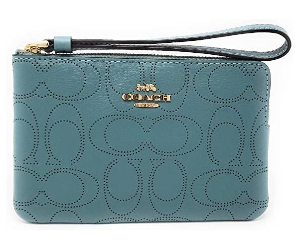 Signature coated canvas and smooth leather Two credit card slots Zip-top closure, fabric lining Wrist strap attached 6 1/4″ (L) x 4″ (H) x 1/2″ (W)