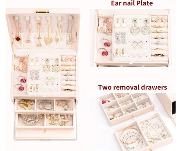 - 【3 Layer & Big Capacity】7rings grooves, 9 ring cases, 6 necklace hooks with 36 ear stud cards, 6 adjustable space, 2 big compartment. With various Design and compartments, this jewelry organizer will hold all your precious things, from Earrings to bracelets