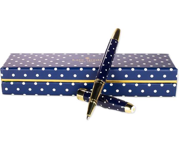 • Opinion: good-looking tools make working a lot more fun. Like this ballpoint pen by Kate Spade New York, for example, covered in a classic navy/white polka dot print with an engraved logo around the cap