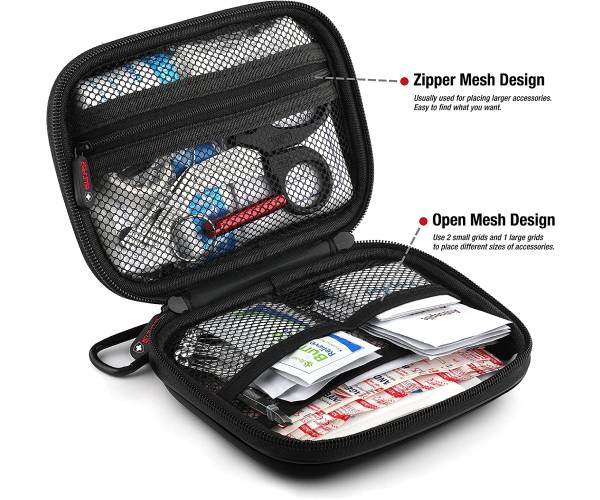 • For your convenience, the first aid kit is designed with high-quality waterproof PU material and waterproof zipper, and is equipped with carabiner.